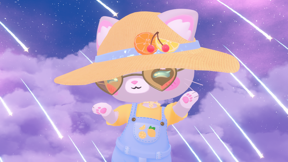 This pack includes 3 separate avatars. The first cat is sporting some cute fruit-themed overalls, as well as a fruit sunhat and heart sunglasses. The second cat is wearing a star-themed extra long sleeved sweater, it has wiggly star hairpins and includes a drippy moon star pet! The third cat is a combination of the two outfits and all their features.